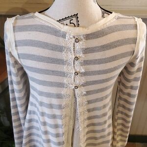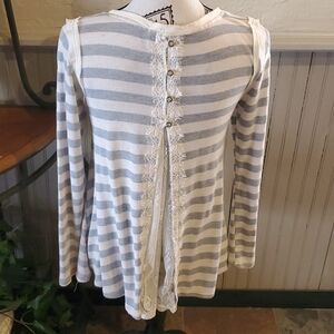 💞Rewind* Beige/gray stripe Top!! Long sleeve Raw edge trim Buttins/Lace inset back pleat Super Cute!!