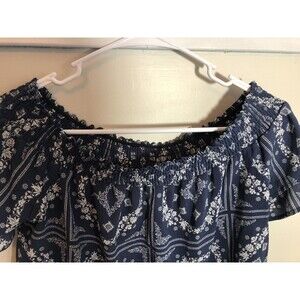 Up for sale is this women's off the shoulder top. Blue and white design, size small.