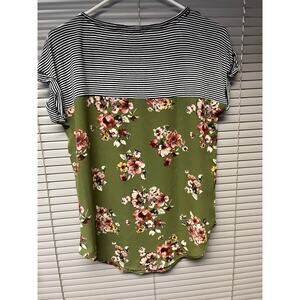 Rewind floral stripe top, green floral shirt, striped and floral tee, boho chic blouse, women’s short sleeve top, casual mixed print top, Rewind size A shirt, olive green floral tee, colorblock t-shirt for women