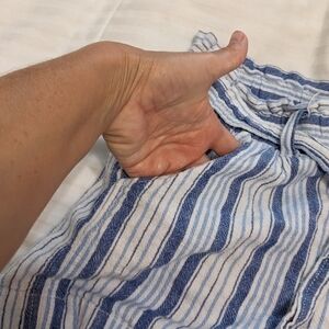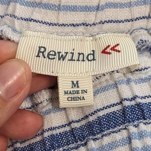 super cute rewind striped linen blend shorts size medium. these are great for the warmer months. it has a sturdy elastic waistband and an attached tie in the front. it has two front pockets. these are super cute and nice and lightweight. please have a good amount of stretch. unstretched the waist measures 15 in, the rise measures 11 and 1/2 in, and the inseam measures 3 in.