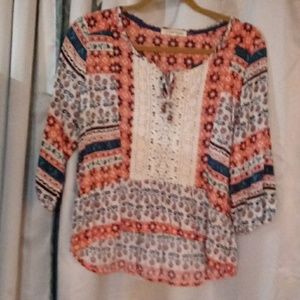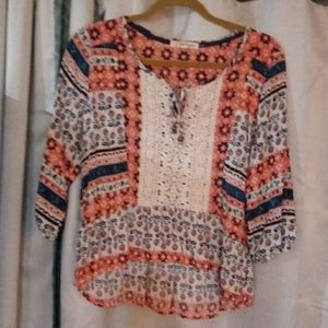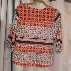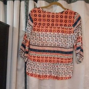 This rewind top has a lot of bright colors.it has light orange, dark blue, light blue, white, green blue and beige.The beige is macrome down the center of the top.The tie on the top has wooden balls to tie the top. The top has bell sleeves that have an elastic wrist..The top hangs down lower in the back and the front is a little bit shorter. The top is very colorful and extremely gorgeous. It is a size medium..❤ please check out my other items for sale along with my betsey johnson for a deal.