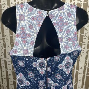 Rewind Textured High Neck Cut Out Fit & Flare Dress. Features a lightweight scuba type fabric with polka dots pressed into the fabric for texture, allover geometric floral print in shades of blue white & pink, triangle cut out detail in back with double button closure, exposed zipper in the back, high neck, pleated fit and flare styling, unlined but there is double fabric in the top front area so you can wear this without a bra. Gently worn and clean with one tiny flaw - some loose threads by the seam up near the zipper in the back (see last pic). See pics for measurements. This dress has a really nice weight and feel to it and is very flattering on!