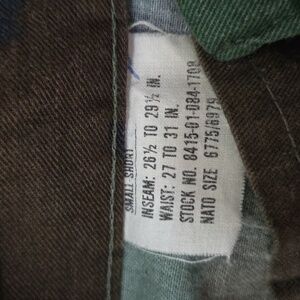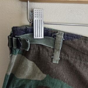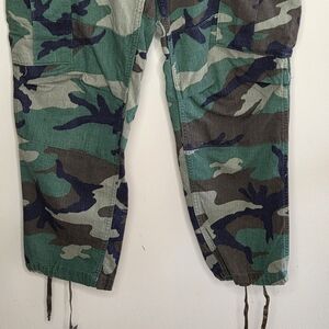 Military woodland camo pants with cargo pockets, adjustable waist, and cinch ties on hem.