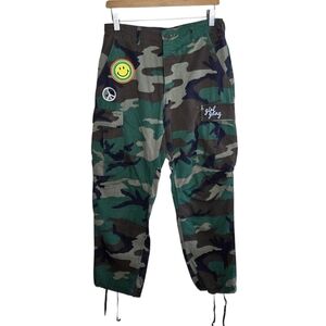 Reworked Camoflauge Combat Pants with Smiley Face Girl Gang Peace Patches