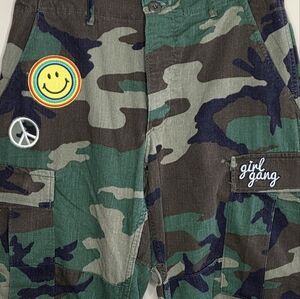 Reworked Camoflauge Combat Pants with Smiley Face Girl Gang Peace Patches.