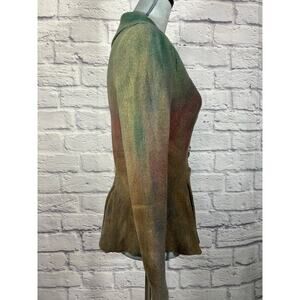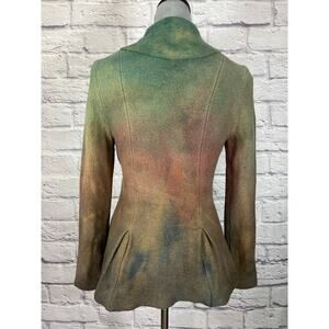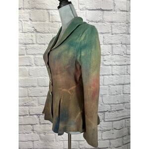 Add a pop of boho chic and unique style to your wardrobe with this reworked, custom-dyed wool peplum blazer jacket! This statement piece features a flattering peplum silhouette and a one-of-a-kind dye job that is sure to turn heads.