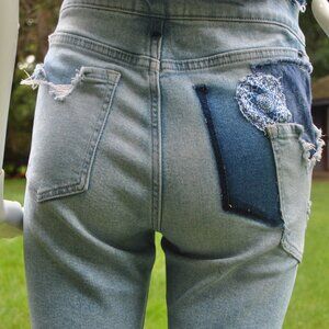 Reworked ripped denim shorts with fun detailing of raw edge waist and floral patch pockets on wearer's back right pocket. Size 26