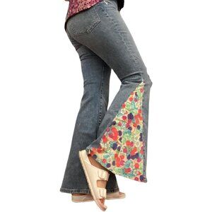 I created these using NWOT Express medium wash high waisted bootcut ripped jeans and added panels of vintage fabric with a raspberry floral pattern. The jeans are a size 10 and have a bit of stretch.
