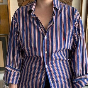 Reworked Ralph Lauren button down. Multi strip red blue white size xxl but can fit large to xxl as the back tie is adjustable. Simon miller dupe