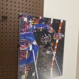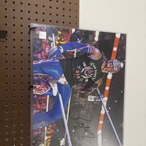 Rey Mysterio Enters the Ring autographed and framed 8" x 10" WWE Wrestling Photo. This collectible features the iconic wrestler in action, making it a must-have for any fan or collector. The autograph is clear and prominent, enhancing its value and authenticity. The photo comes professionally framed, ready for display. Perfect for a sports memorabilia collection or a gift for a wrestling enthusiast.