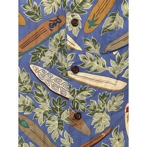 The product is a men's Hawaiian shirt from Reyn Spooner in size large. The shirt features a floral pattern, short sleeves, and a button closure, made from blue rayon fabric. With a regular fit and Hawaiian theme, this button-up shirt is perfect for casual occasions and adds a touch of island style to any outfit.