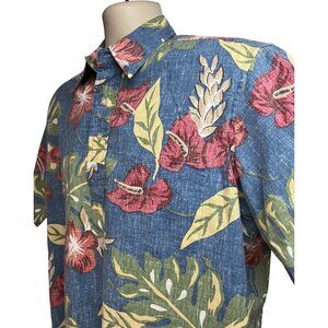 Reyn Spooner Mens Vintage Blue Hawaiian Aloha Floral Reverse Print Pullover Shirt Medium Pocket Lightweight Cotton Blend Made in Hawaii USA. Great Pre-Owned Vintage Condition Gently Worn. Ships from smoke free home.