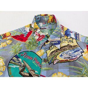 This small men's rayon short sleeve shirt by Reyn Spooner features a graphic print design with a Hawaiian theme, perfect for various occasions such as casual wear, parties, or work. The collared shirt with button closure and multicolor pattern is made from a comfortable blend of rayon and cotton, suitable for all seasons. With a regular fit and classic Hawaiian character, this shirt is a timeless addition to any man's wardrobe.
