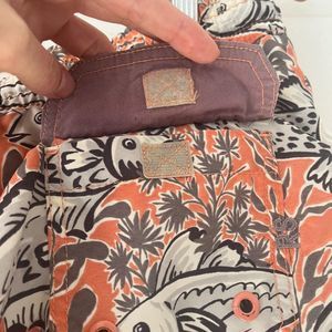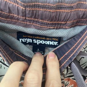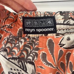 Reyn Spooner Koi Fish print Hawaiian board shorts, size L, excellent pre-owned condition. Draw string, elastic waist, side pockets, velcro'd back pocket.