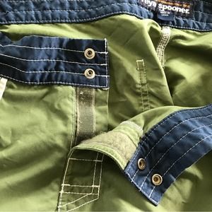 Excellent clean condition. Snap waist Green with blue trim, Velcro back pocket, unlined, out seam 18" inseam 5".