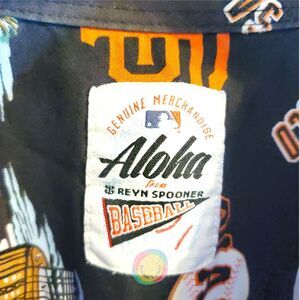 Here is a men's San Francisco Giants scenic button-front shirt from the premium Aloha brand, Reyn Spooner. This is a 100% Cotton version of their classic MLB shirt, featuring Oracle Park and other iconic San Francisco imagery. It has unique baseball-themed buttons.