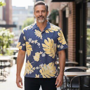 The Reyn Spooner Shirt for men in blue and yellow is a commemorative classic Hawaiian shirt that features a floral pattern and a spread collar. Made of cotton with a regular fit, this short sleeve button-up shirt is machine washable and designed in the United States. The shirt is perfect for men looking for a casual yet stylish addition to their wardrobe, with a touch of Hawaiian theme and flair. SMOKE FREE HOME