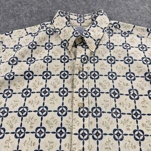 Reyn Spooner Shirt Mens Large Beige Navy Hawaiian Aloha Button Up Short Sleeve