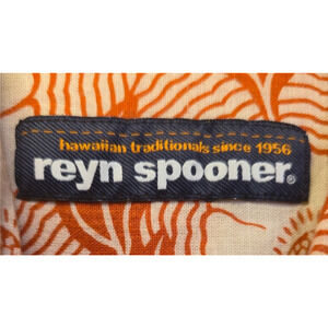 The Reyn Spooner Shirt for men in XL size offers a vibrant orange floral pattern, perfect for a casual Hawaiian-themed look. Made from a comfortable linen and cotton blend, this short sleeve button-up shirt features a collared neckline and spread collar style. With a regular fit and machine washable fabric, it is suitable for all seasons, especially summer and spring. The woven fabric and button accents add a touch of authenticity to this stylish and easy-to-care-for addition to any man's wardrobe.