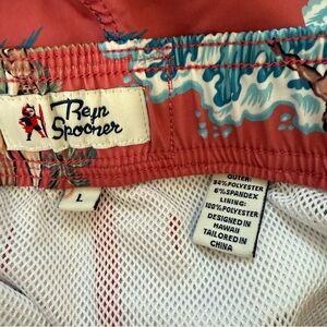 Bold red board shorts with surf and wave design. Ideal for beach fun.