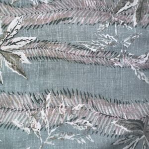 Classic vintage Reyn Spooner aloha shirt in a light seafoam green base with abstract floral and fern stripe pattern in pink, white, and muted brown tones. Features a pullover design with a four-button placket and button-down collar.