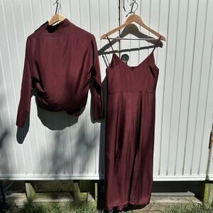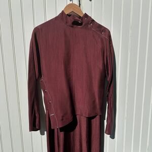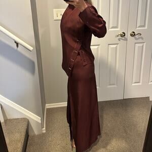 I love this gorgeous set from Róhe; it is giving that Carolyn Besette-Kennedy / 90s / clean minimalism 90s Calvin Klein / Narciso Rodriguez vibe. The slip-style dress features double slits at the front & back, adjustable straps, a v-neckline, and tailored details. The top features an asymmetrical side hem, functional buttons down one arm / on one side of the bottom hem, and a batwing sleeve cut. Both are unlined. Color "Mulberry", a true burgundy (comes out a bit orange red in my pics than it actually is). Dry clean. FR size 36 (US size 4). Measurements in pics. Love this but it's better suited for longer, slimmer frame. I'd say it runs a bit more like a US 2. Retailed for $990 Brand new and unworn with original retail hang tags.