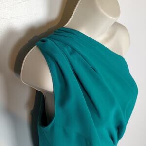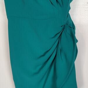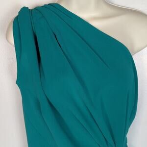 Teal. Fabric drapes over the right shoulder and is gathered with a removable loop of material in the back. The skirt gathers at the left side of the waist with a decorative fabric detail. Long slit on the left front side. Short train can be bustled in back with a loop and button or worn long. Laid flat pit-to-pit: 15.5in. Laid flat waist: 11.5in. Shoulder to hem: 56in. Some picks in the fabric (see photos), but overall in excellent condition: no holes, stains, or fraying.