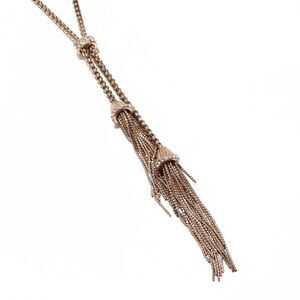 Add a touch of glamour to your look with this stunning tassel-style statement necklace. Fashioned in a rich gold-tone finish, this eye-catching piece features sparkling clear rhinestone accents at the top of the drop and at the top of the flowing tassels. The necklace measures approximately 28" to the top of the tassel drop, with an additional 2 1/2" extender chain for adjustable length. The tassel drop itself measures about 6 1/2" from the top of the tassels to the end of the longest strand, creating a bold and elegant silhouette. Fastens securely with a lobster clasp.