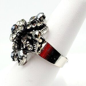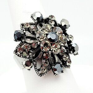 Rhinestone Burst Bypass Ring Adjustable One Size Silver Tone Smoky Stones EUC