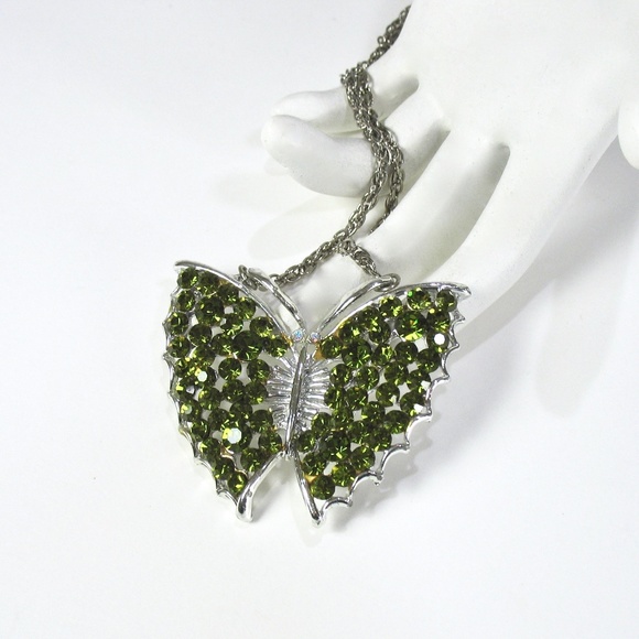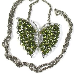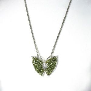 Vintage rhinestone butterfly necklace, c.1970’s. It’s silver tone, 2 1/4” wide x 2” tall and is on a 24” chain (lavalier 12” each side). The rhinestones are a sparkly moss green.