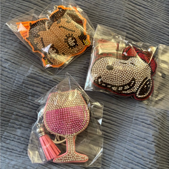 Set of three rhinestone keychains featuring cartoon characters and a wine glass. Vibrant and sparkling design.