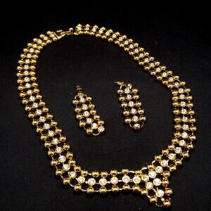 This is a beautiful clear rhinestone necklace and post earrings set in a 1980s style with very light weight gold tone metal and fold over clasp. There are three rows of built in beads with the center holding a clear rhinestone. The necklace is 18 inches and the width at the front V is 1 1/8 Inches. The light weight earrings are 2 inches in length and 5/8 Inch wide with the single clear rhinestone attached to the post.