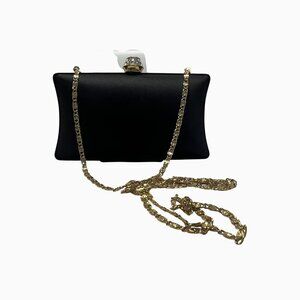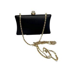 Rhinestone Clasp Classic Preppy Black Satin Clutch Purse Gold X Body Chain Strap