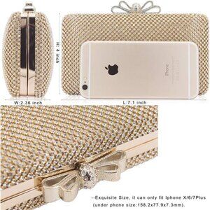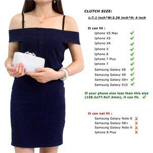 Approx. Length 7.1’’ * Width 2.4’’ * Height 4’’. Dexmay bling minaudiere can only fit regular size phone.