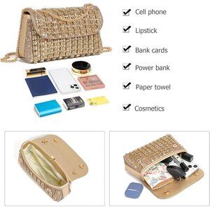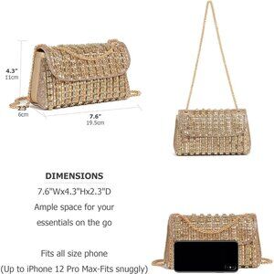 Spacious Design: Measuring 7.6" (19.5 cm) in length, 2.3" (6 cm) in width, and 4.3" (11 cm) in height, this glittering evening bag offers ample space for essentials like a cell phone, cards, cash, car keys, a small wallet, glasses, a compact mirror, lip gloss, and gum.
