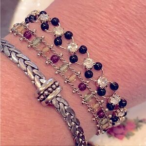 Chic bracelet featuring black beads, silver tone circle links, crystal rhinestones. Minimalist style. Maximalist style stacked with other bracelets. Perfect touch of bling.