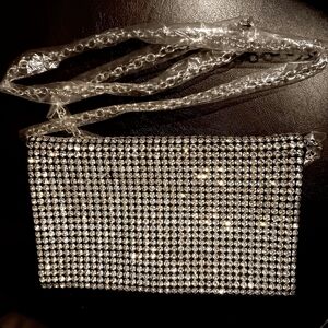Perfect evening bag. Fits cellphone or flat wallet. Lots of sparkle. Silver Chain strap. Snap Button closure. Black satin fabric. Brand new.