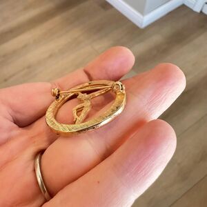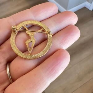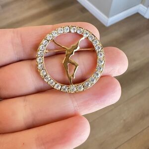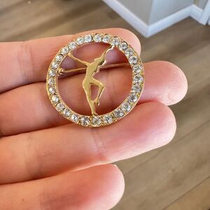 Beautiful pin with gold tone dancer surrounded by a circle of rhinestones