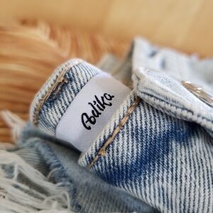 Design/Details: Super cute and stylish distressed denim shorts adorned with hanging rhinestones. Design features button zip fly entry and premium no stretch denim.