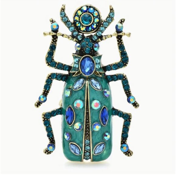This vintage beetle brooch features rhinestones in shades of blue and green. Intricately designed for a bold and stylish statement.