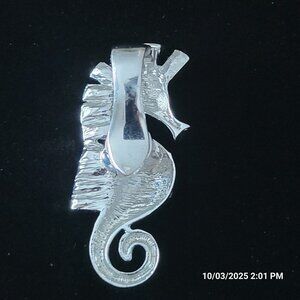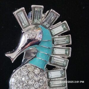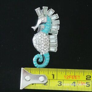 The Rhinestone Enamel Seahorse Pendant is a beautiful piece of vintage jewelry featuring a magnetic closure and clear crystals as the main stone. The pendant is designed in a silver and Agua color scheme, with a beach, animal, and sea life theme. Perfect for those who appreciate unique and stunning accessories, this pendant adds an elegant touch to any outfit with its intricate design and attention to detail.