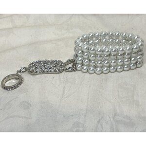 Rhinestone & Faux Pearl Gracie Slave Bracelet. White beaded, simulated pearl stretch bracelet with a art deco-inspired panel connecting to a glass crystal encrusted band ring. Good pre-owned, Age-appropriate wear condition. Another item from my Fabulous Estate Sale Finds. *For over 40 years I've sourced hundreds of thousands of pieces of jewelry from Estate Sales, resellers and reputable sales channels. Far too many to thoroughly inspect and/or clean every one of them. Selling as is/as found, no cleaning or testing is done. *SEE PICS-Since opinions of condition of item may differ, please enlarge and carefully examine photos as they are an essential part of the description. Displays NOT included. *I source all my inventory from Estate Sales and reputable sales channels and make every effort to sell only authentic merchandise from brand new to used. If you have any questions or need more pictures just ask.