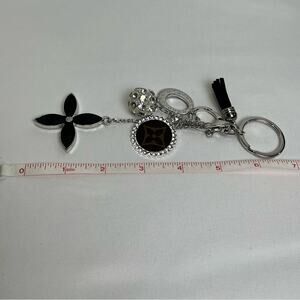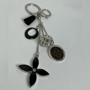Rhinestone Fleur Clover, Black and Silver Keychain with an authentic Louis Vuitton canvas Cabochon.