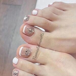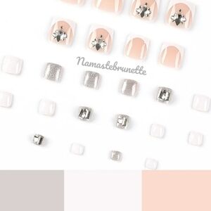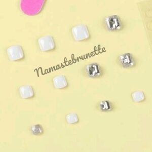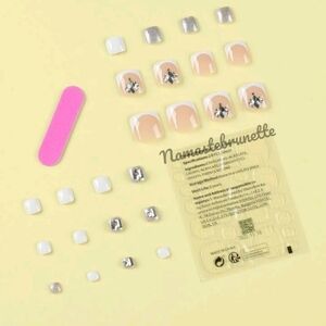 Short Nails | Rhinestone French Tip Pattern Nails | Square Nails | Fake Nails | False Nails | Press Ons | Summer Nails | Beach Nails | White Silver | Manicure | Pedicure Toenails | Pedi | Wedding Nails