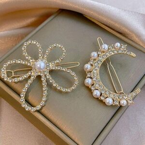 Add a chic touch to your hairstyle with this gold hair clip set featuring elegant rhinestones & simulated pearl accents. Perfect for any occasion.