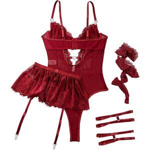 Rhinestone Heart Garter Lingerie Set: Mesh Babydoll, Stockings & Teddy