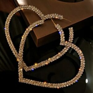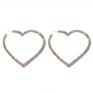 These exaggerated gold heart-shaped hoop earrings feature a dazzling design with shimmering stones that catch the light beautifully. The open heart silhouette adds a touch of elegance, making them a perfect accessory for any glamorous occasion.