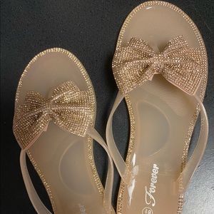 Precious sandal with rhinestones and rhinestone bow! Color is nude. Size 8 1/2.
