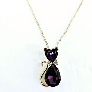 Are you searching for a meaningful gift for a cat lover in your life? Look no further! This cat birthstone necklace combine the beauty of jewelry with the personal touch of celebrating your loved one's beloved feline friend's birth month. This is made with a deep purple amethyst colored stone in a gold tone setting. One pear shaped stone makes up the body with a heart shaped stone as the head and two small round rhinestones make up the ears. The cat is finished with a glimmering icy clear rhinestone bowtie. The chain is gold tone with a small gold cat charm at the end. There is no marking on the chain so I am not sure if it is gold plated or not. The chain measures 16" and can be adjusted up to 18". The charm itself is 1.25".