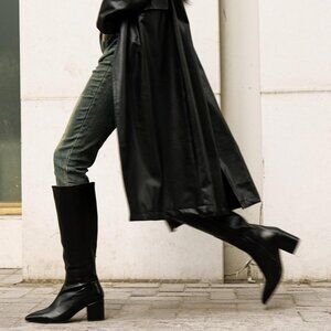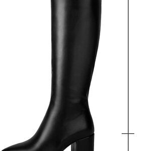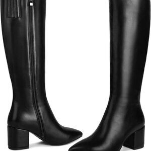 Features: These stylish knee-high boots feature a sleek matte black leather exterior with sparkling rhinestones for a touch of glamour. The pointed toe and chunky 6.5cm heel balance style with comfort, making them perfect for long wear—whether you're heading to a date, a wedding, a music festival, or a night out.